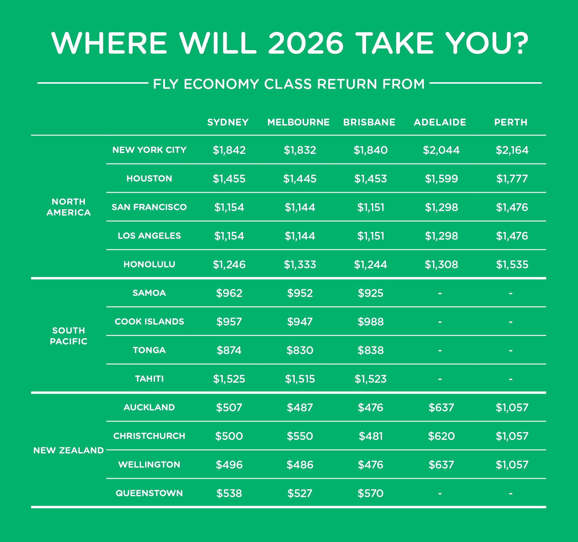 *Conditions apply. On sale until 20 January 2026, unless sold out prior. Viva Holidays packages valid for travel as specified. Air New Zealand airfares valid for travel on selected dates between 19 January - 9 December 2026; seasonal surcharges and blackout dates apply. Prices are per person in Australian dollars and are correct as at 23 December 2025 but may fluctuate if surcharges, fees, taxes or currency change. Offers subject to availability. Agents may charge service fees, rates vary. Prices displayed are ‘from’ pricing, includes all prepaid taxes and fees, except payment card fees which may be payable in addition, rates vary. Prices displayed are based on the departures dates as displayed. Alternate travel dates are subject to a seasonal surcharge. Day of week surcharges, flight restrictions and blackout dates may apply. Please check all prices, availability and other information before booking. Air New Zealand, Viva Holidays and Helloworld Travel Booking Terms and Conditions apply. ABN 84 003 237 296.